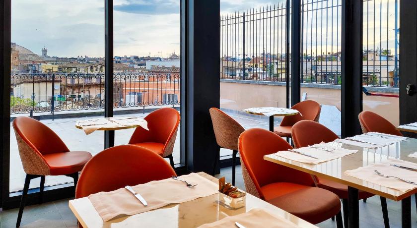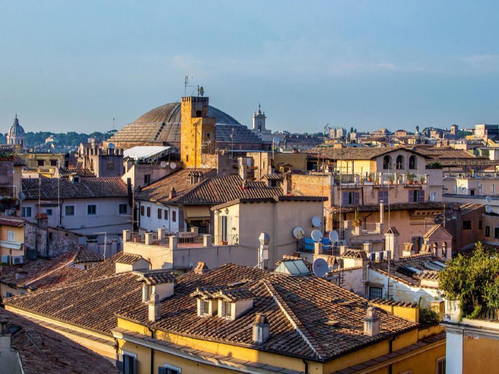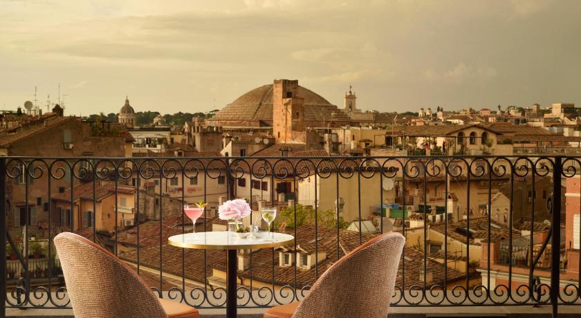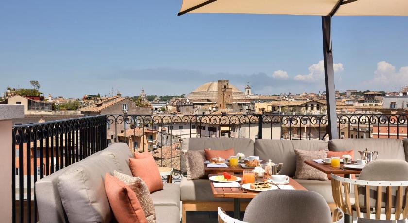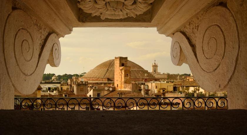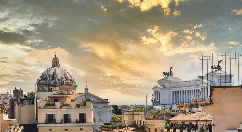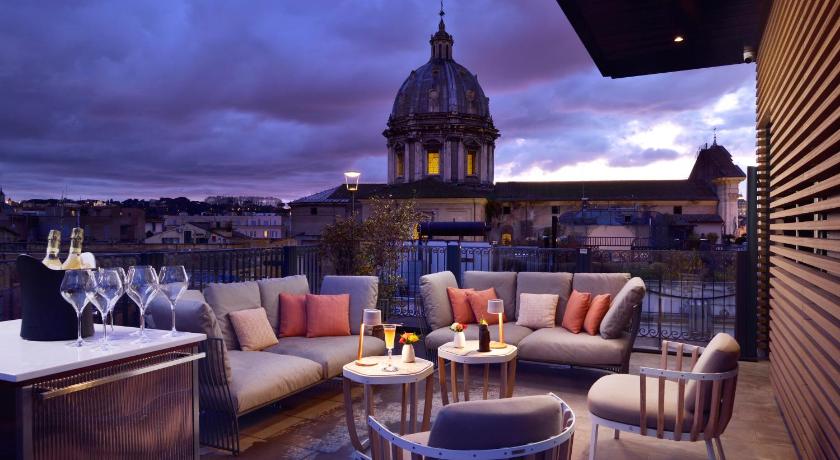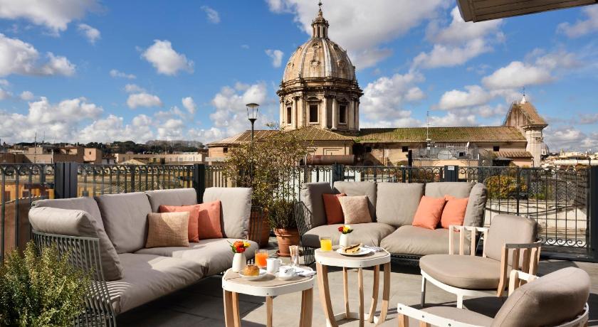Outside, the view of Corso Vittorio Emanuele II connects guests directly to the rhythm of central Rome.