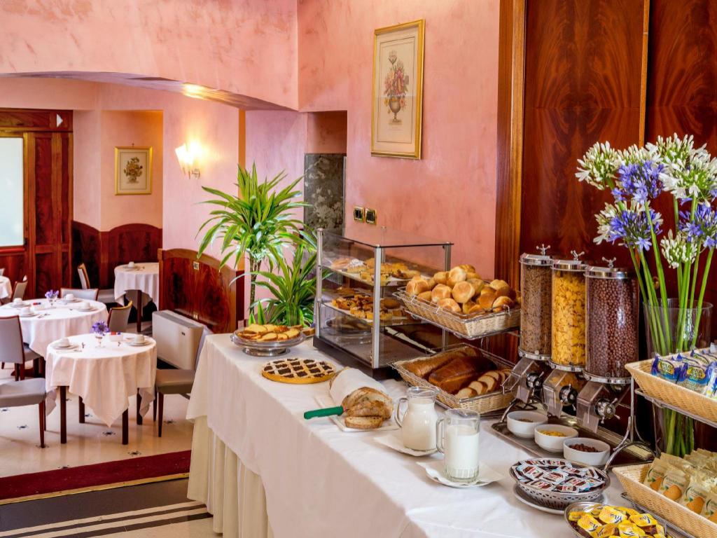 The gallery of Hotel Tiziano Rome reveals its historic beauty—arched windows, marble floors, and period décor that evoke classic Roman grandeur. Images showcase the luminous lobby, breakfast hall, and serene guest rooms adorned in warm tones and elegant fabrics.